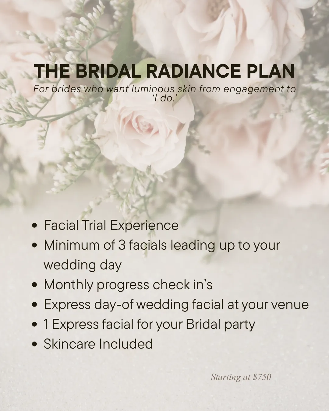 - Tailored Bridal Packages: Whether it's a solo session for the bride or a full bridal party treatment experience, we customize every step- from facial selection to timing for advanced treatments and injectables leading up to the wedding.