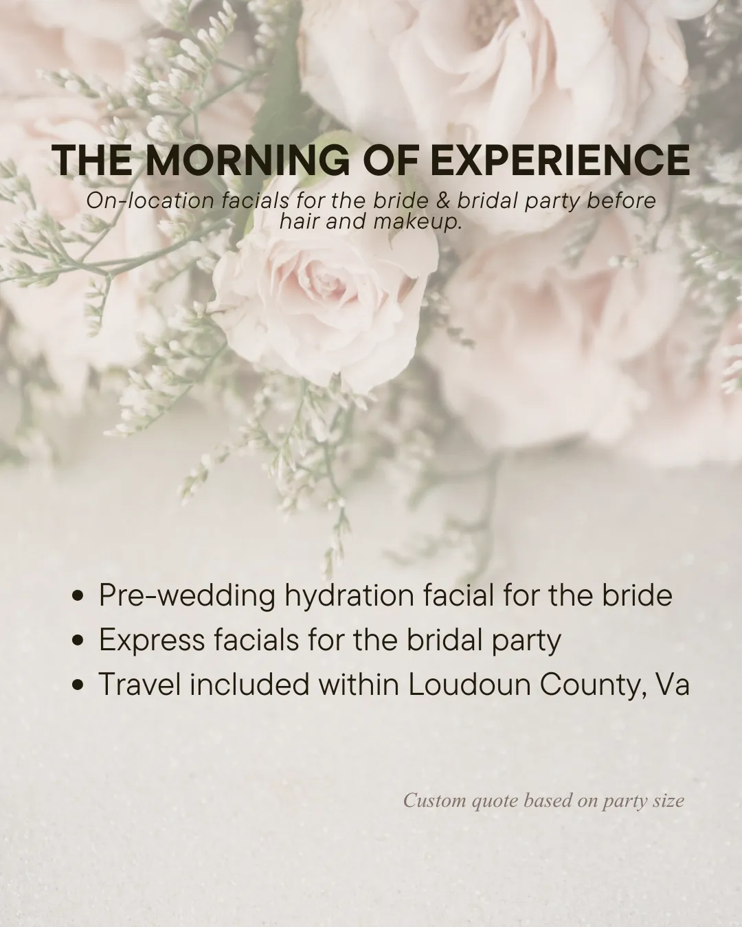 - Exclusively located in Loudoun County, Virginia: We are the only studio offering on-location facials the morning of your wedding, so you can relax while your skin gets a professional, luxury treatment before you walk down the aisle.